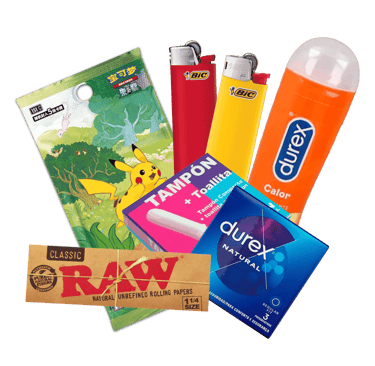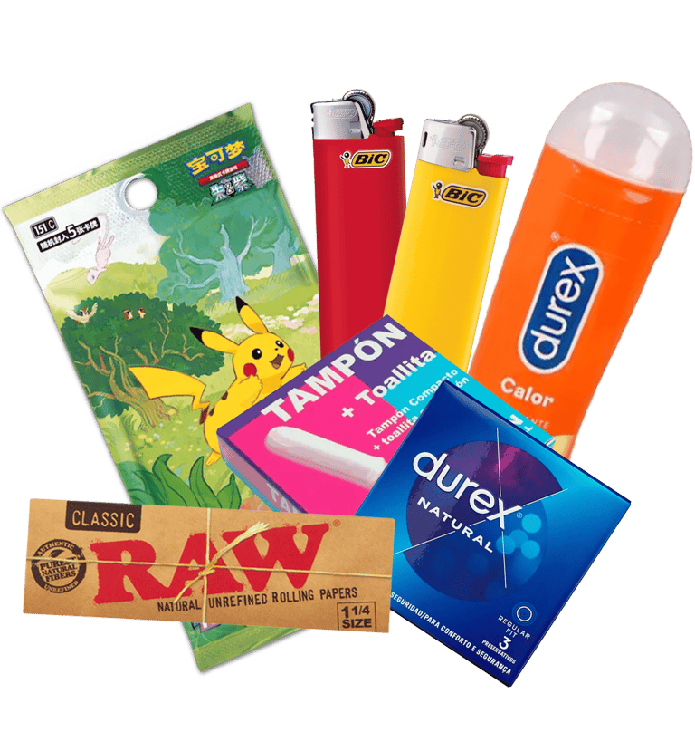 Artículos prácticos para el día a día: papel de fumar, mecheros, higiene femenina, preservativos, desodorantes y hasta sobres Pokémon.